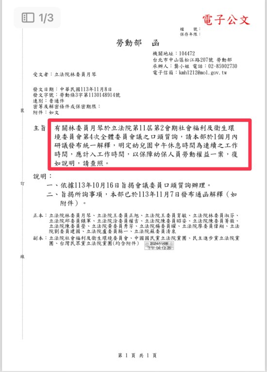 謝謝林月琴委員主動關注教保人員勞動議題,來訊由本會提供相關數據,作為委員監督教保人員午休工時的參據。