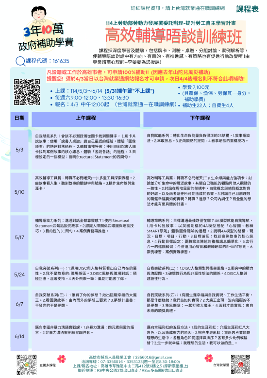 【3年10萬】 政府補助課程表<高效輔導晤談訓練班>