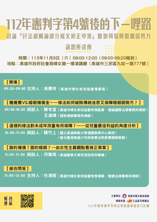 高雄市婦女新知協會舉辦【112年憲判字第4號後的下一哩路——討論「民法親屬編部分條文修正草案」應如何保障婚姻弱勢方】,邀請相關領域的專家學者一同與談。